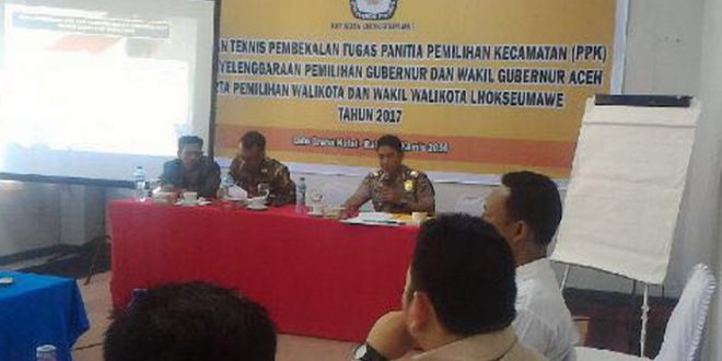 Kegiatan yang diikuti oleh 20 anggota PPK se-KIP Kota Lhokseumawe yang dilaksanakan di Ruang Seulanga Hotel Lido Graha selama dua hari sejak tanggal 27 hingga 28 Juli 2016 tersebut, AKP Ahzan yang mewakili Kapolres Lhokseumawe AKBP Hendri Budiman, SH, S.Ik, MH menjelaskan tentang Pola Pengamanan oleh Kepolisian dalam penyelenggaraan pemilihan Gubernur/Wakil Gubernur Aceh dan Walikota/Wakil Walikota Lhokseumawe di wilayah hukum Polres Lhokseumawe.