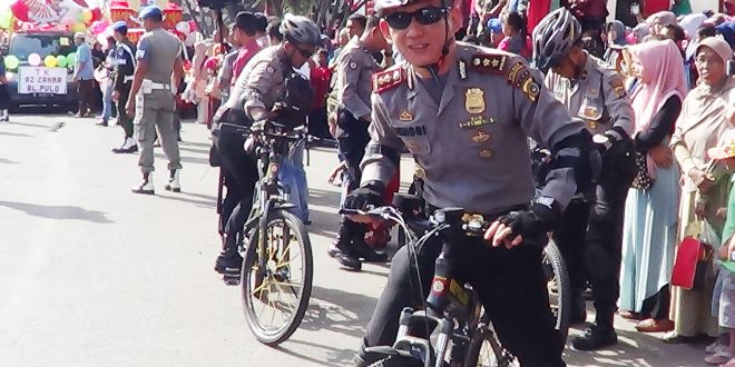 Tribratanews-tribratanews-reslhokseumawe.aceh.polri.go.id- Dengan bersepeda Kapolres Lhokseumawe AKBP Hendri Budiman. SH, S.Ik, MH didampingi Kabag Ops AKP Ahzan. SH, S.Ik, MSM serta personil Sat sabhara, turun langsung pimpin pengamanan rute karnaval dalam rangka memperingati Hari Ulang Tahun Republik Indonesia (HUT RI) ke 71 di Kota Lhokseumawe.