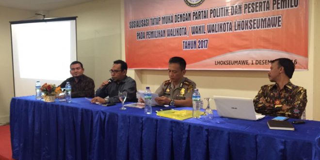 Tribratanews-tribratanews-reslhokseumawe.aceh.polri.go.id- Kapolres Lhokseumawe AKBP Hendri Budiman, SH, S.Ik, MH hadiri sosialisasi tatap muka Partai Politik (Parpol) dan peserta Pemilu, yang dilaksanakan oleh Panwaslih Kota Lhokseumawe dalam rangka pengawasan untuk mensukseskan Pilkada di Aceh khususnya Kota Lhokseumawe.” di Aula Hotel Harun Square Kota Lhokseumawe.” Kamis ( 1/12/2016 )