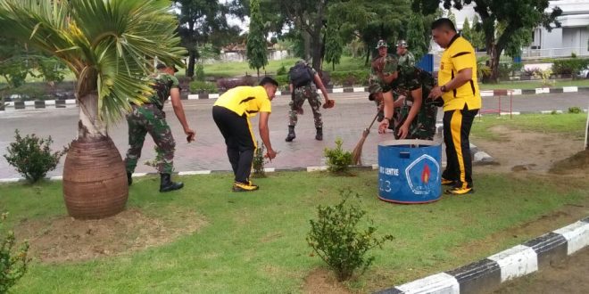 Dengan peralatan cangkul, sabit, sapu dan kain lap, personel gabungan membersihkan setiap sudut ruangan di dalam Masjid dan halaman serta sebagian personel membersihkan kamar mandi dan tempat wudhu.