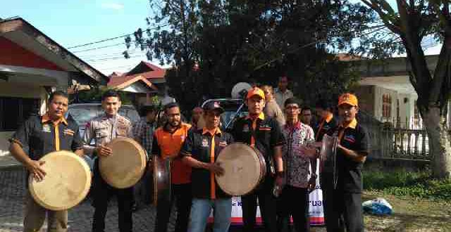Terlihat tim pengawas pemilu kecamatan (PPK) menggunakan Rapai sebagai media untuk menarik perhatian warga saat roadshow tersebut dilakukan dengan dikawal personil Kepolisian dari Polres Lhokseumawe.