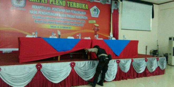 Tribratanews-tribratanews-reslhokseumawe.aceh.polri.go.id-Polres Lhokseumawe kerahkan Tim Jibom Brimob Jeulekat sisir lokasi Rapat Pleno penghitungan suara Paslon Walikota/Wakil Walikota Lhokseumawe dan Gubernur/Wakil Gubernur Aceh yang digelar oleh Komisi Independen Pemilihan (KIP) Kota Lhokseumawe di Ballrom Hotel Harun Squer Jalan Samudera Baru Dusun Gampong Kramat Desa Simpang Empat Kecamatan Banda Sakti Kota Lhokseumawe.” Kamis pagi 23/2/2017 sekitar pukul 08.00 wib