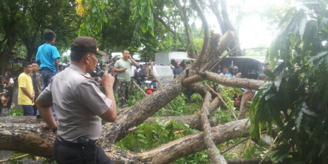 LHOKSEUMAWE- Polisi atur lalu lintas jalan yang tiba-tiba macet akibat Pohon tumbang dan melintang di dua sisi badan Jalan Medan–Banda Aceh Desa Blang Panyang, Kecamatan Muara Satu, Lhokseumawe, Rabu (24/5/2017) sekitar pukul 14.30 WIB.