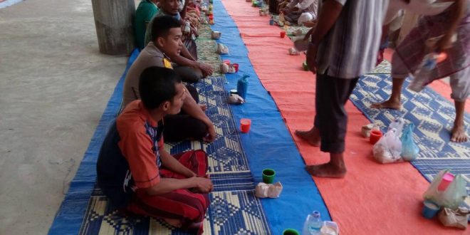 LHOKSEUMAWE- Bhabinkatibmas Polres Lhokseumawe Sektor Kuta Makmur Brigadir Rizalul Azis melaksanakan buka puasa bersama di Mesjid besar Darul Muhya Kecamtan Kuta Makmur Kabupaten Aceh utara, Aceh, setelah berbuka Bhabinkatimas tersersebut shalat Isya dan taraweh berjamaah bersama Masyarakat”Sabtu 17/6/2017 sekitar pukul 18.47 Wib