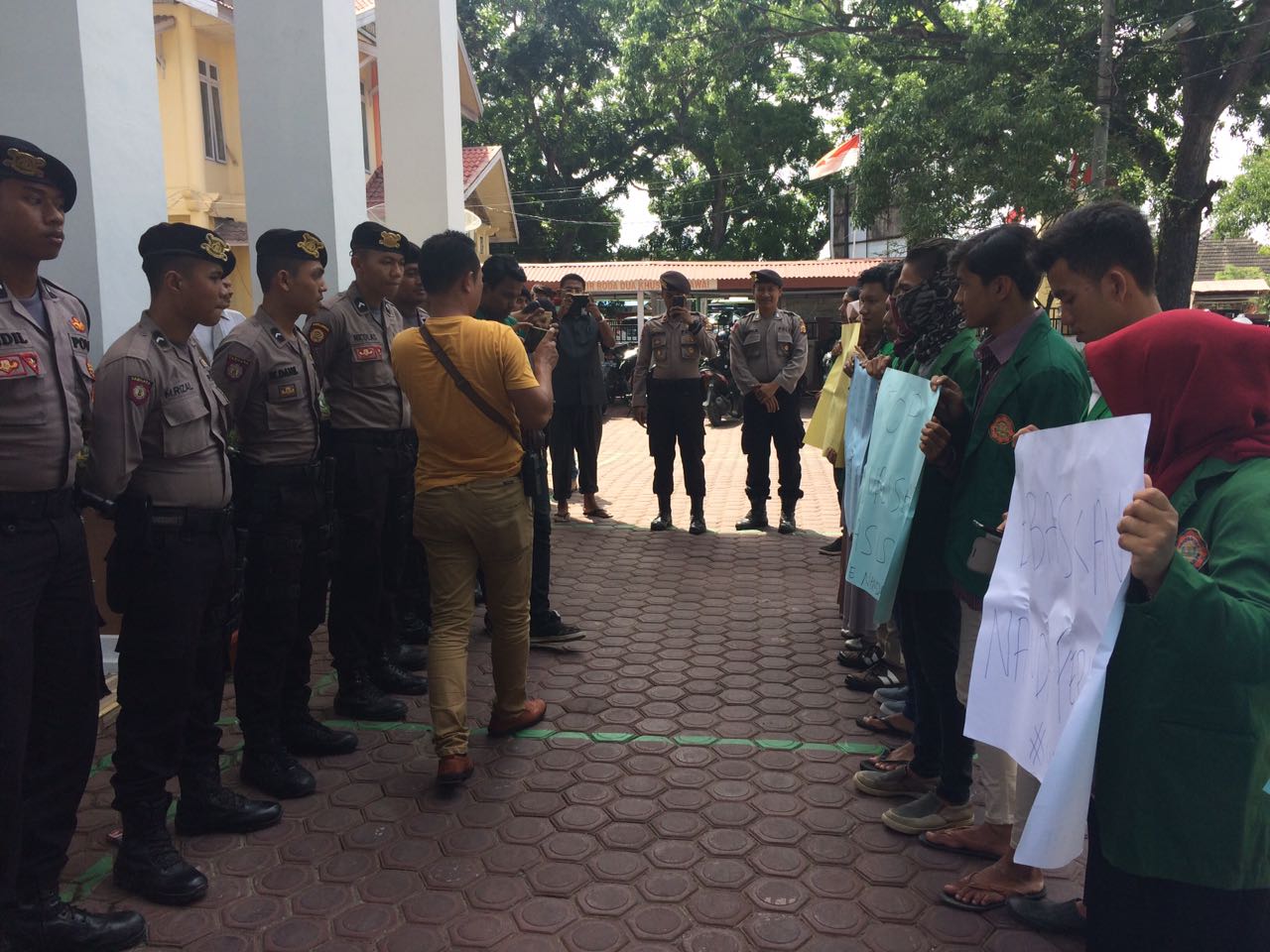 LHOKSEUMAWE- Personil Polres Lhokseumawe kawal aksi solidaritas puluhan mahasiswa Unimal dengan mendatangi dan mengikuti sidang pembelaan terdakwa di kantor pengadilan negeri (PN) Lhokseumawe kelas IB, jalan iskandar muda Desa kampung jawa lama Kecamatan Banda Sakti Kota Lhokseumawe.”