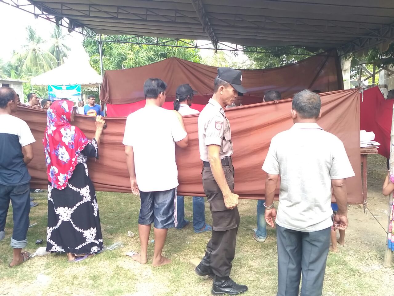 Personil polisi melakukan pengawalan ketat pemilihan geuchik di halaman meunasah dusun keude blang Desa Lancang Barat, Dewantara.