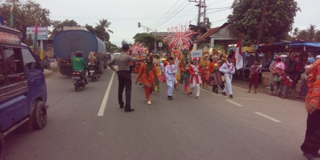 LHOKSEUMAWE- Personel Polsek Syamtalira Bayu mengatur lalu lintas saat karnaval menyambut HUT RI ke 72 diadakan di kecamatan tersebut. Hal itu dilakukan untuk memberikan kenyamanan kepada masyarakat serta mencegah terjadinya kemacetan panjang di jalanan.” selasa pagi (15/8/2017)