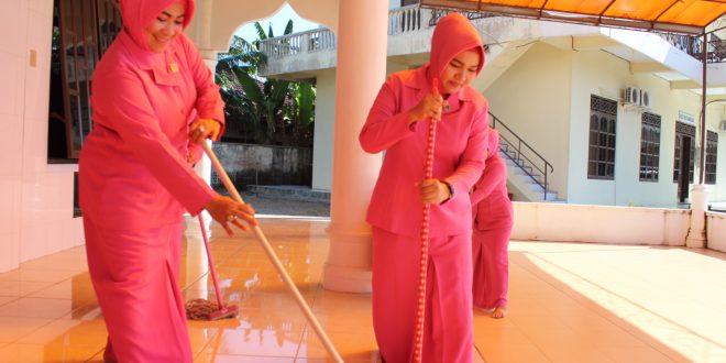Terlihat sejumlah pengurus bhayangkari sangat bersemangat menyapu, membersihkan kaca dan mengepel lantai Mesjid, hingga area mesjid menjadi lebih bersih.