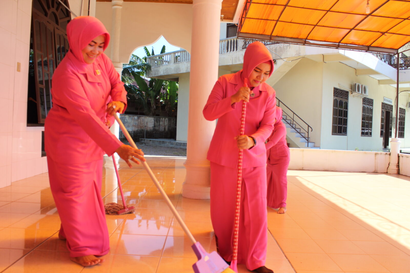 Terlihat sejumlah pengurus bhayangkari sangat bersemangat menyapu, membersihkan kaca dan mengepel lantai Mesjid, hingga area mesjid menjadi lebih bersih.