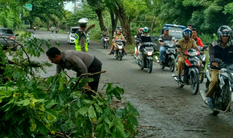 Polisi bersama warga akhirnya mengevakuasi pohon tumbang tersebut yang menutupi badan jalan, dengan menggunakan alat seadanya.