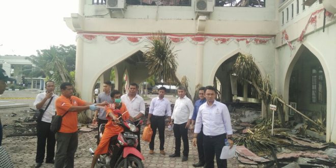 Lhokseumawe- Satuan Reskrim Polres Lhokseumawe bersama tim Pusat Laboraturium Forensik (Puslabfor) cabang Medan, Sumatera Utara melakukan pra rekontruksi terhadap kasus dibakarnya gedung rektorat Universitas Malikussaleh (Unimal) Aceh Utara, Senin (21/8/2017).