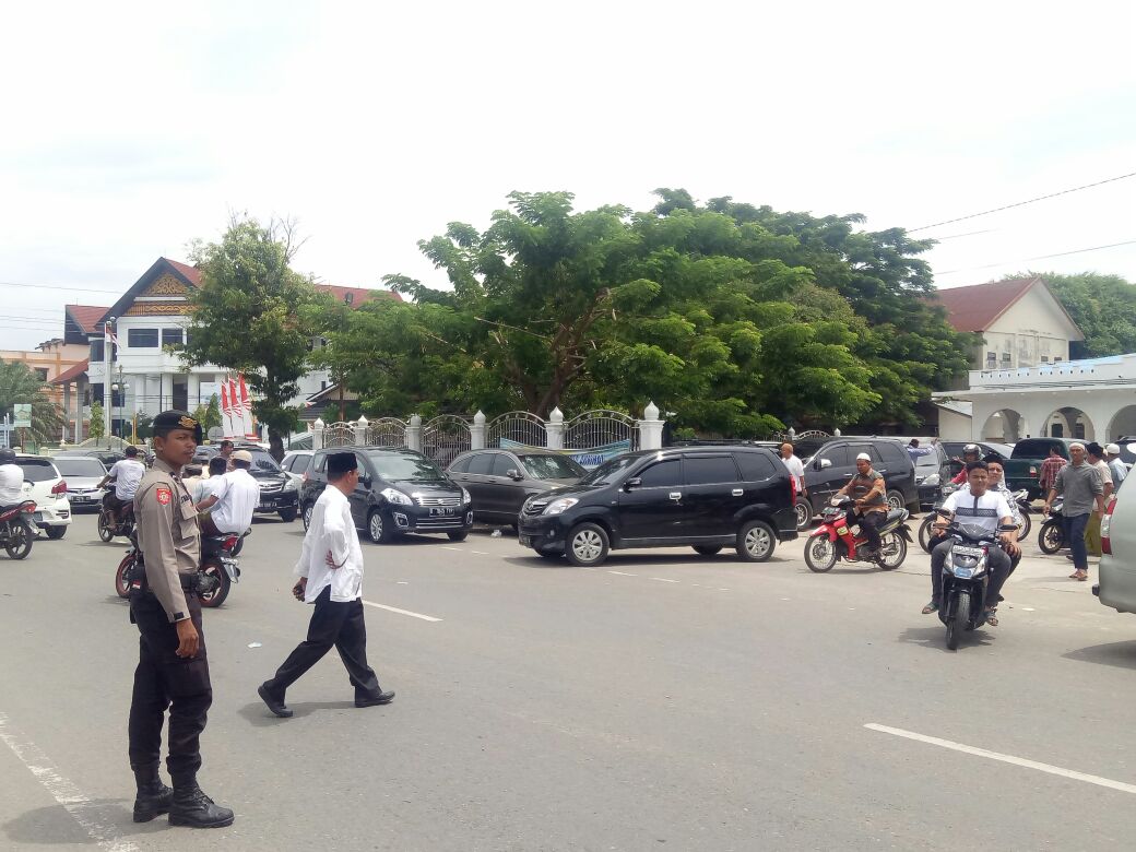 Lhokseumawe- sejumlah Polisi dari satuan Sabhara Polres Lhokseumawe memberikan pelayanan pengamanan sholat Jum’at di Mesjid Jami’ dan Islamic Centre Kota Lhokseumawe.” Jum’at siang (11/8/2017)