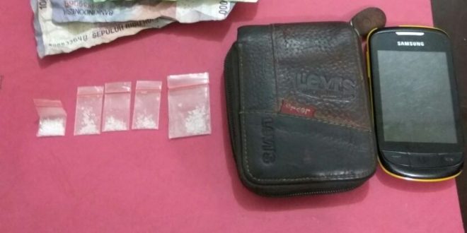 Sambungnya, dari penggerebekan tersebut meringkus seorang pria an. IH (22), dan setelah diintrogasi dan geledah badan tim berhasil mengamankan 5 paket diduga sabu dibungkus dalam plastik bening Berles warna merah yang ditemukan didalam dompet warna coklat merk Levis dengan berat keseluruhan Barag bukti 1.20 gram/bruto.