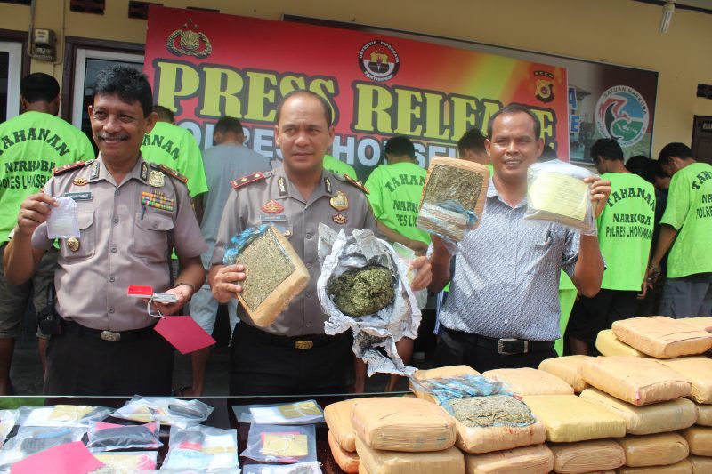 Kapolres Lhokseumawe AKBP Hendri Budiman, SH, S.Ik, MH diwakili Wakapolres Lhokseumawe Kompol Isharyadi S. Ik dan didampingi Kasat Narkoba AKP Mukhtar mengatakan ganja seberat 57 Kg itu merupakan hasil temuan petugas selama bulan Juli kemarin. Temuan itu paling banyak di Kantor Pos Kota Lhokseumawe.