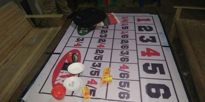 Alat judi yang ditemukan seperti ludo, mangkok untuk memutar dadu serta alas yang digunakan berjudi.