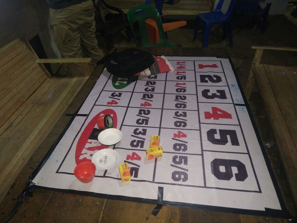Alat judi yang ditemukan seperti ludo, mangkok untuk memutar dadu serta alas yang digunakan berjudi.