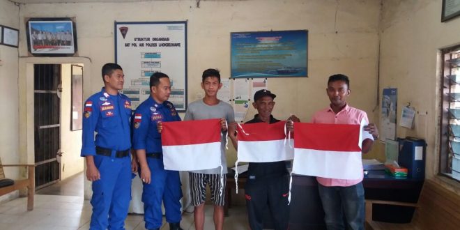 LHOKSEUMAWE- Satuan Pol Airud Polres Lhokseumawe menyerahkan bendera merah putih untuk dipasang di Kapal Motor Nelayan dalam wilayah hukum Sat Pol Airud Polres Lhokseumawe, Sabtu (5/8/2017).