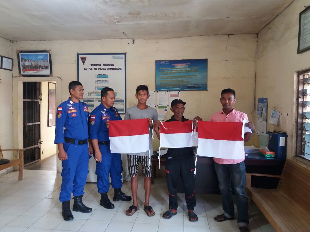 LHOKSEUMAWE- Satuan Pol Airud Polres Lhokseumawe menyerahkan bendera merah putih untuk dipasang di Kapal Motor Nelayan dalam wilayah hukum Sat Pol Airud Polres Lhokseumawe, Sabtu (5/8/2017).
