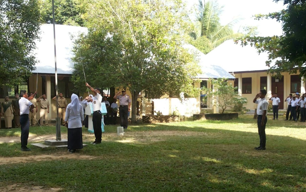 Lhokseumawe- Kapolsek Kuta Makmur Pimpinan Upacara Bendera di lapangan upacara SMP Negeri 1 Kuta Makmur Kabupaten Aceh Utara yang dihadiri Kepala sekolah, Dewan guru, Seluruh siswa dan siswi sekolah tersebut.” Senin pagi (25/9/2017)