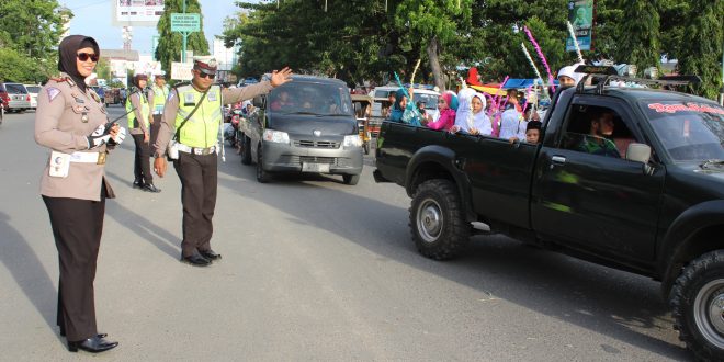 Lhokseumawe- Puluhan personil Polres Lhokseumawe Kawal pawai penyambutan tahun Islam 1439 Hijriah di Kota Lhokseumawe.” Rabu sore (20/9/2017)