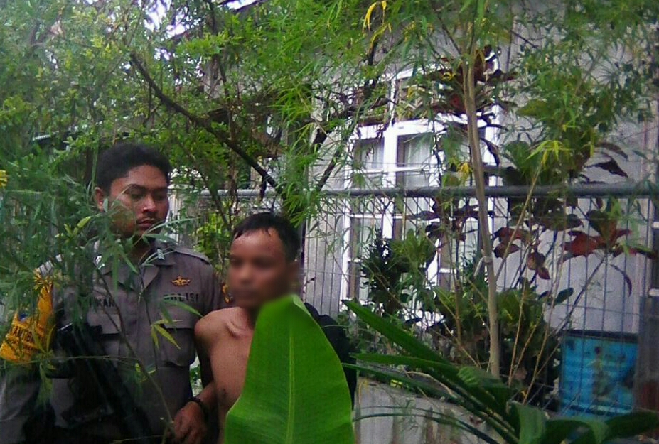 Lhokseumawe- Tanam Ganja disamping rumah, Seorang pria dibekuk Personil Polres Lhokseumawe di Lorong Intan Dusun Merak Desa Cut Mamplam Kecamatan Muara Dua Kota Lhokseumawe. Bersama tersangka turun diamankan 2 batang Pohon Ganja. “Kamis (7/9/2017) sekitar pukul 17.30 Wib