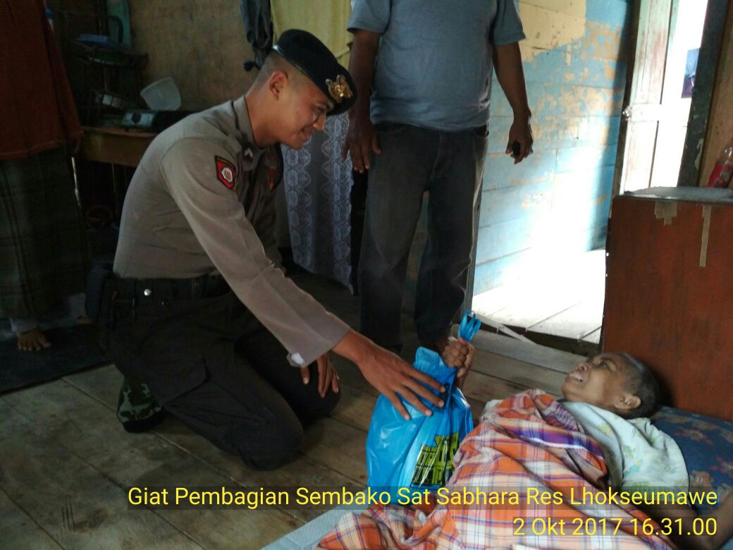 LHOKSEUMAWE- Patroli rutin Sat Sabhara Polres Lhokseumawe kembali berbagi sembako kepada kaum fakir miskin dan duafa dengan memberikan paket sembako di sejumlah Desa di Kota Lhokseumawe.” senin (02/10/2017)