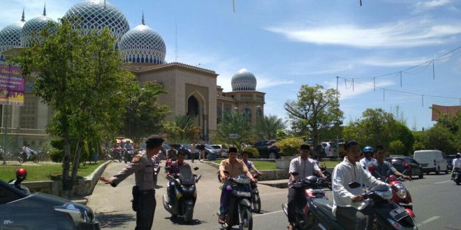 Lhokseumawe- Sejumlah Polisi dari Satuan Sabhara Polres Lhokseumawe memberikan pelayanan pengamanan sholat Jum’at di sejumlah Mesjid di Kawasan Kota Lhokseumawe.” Jum’at siang (20/10/2017)
