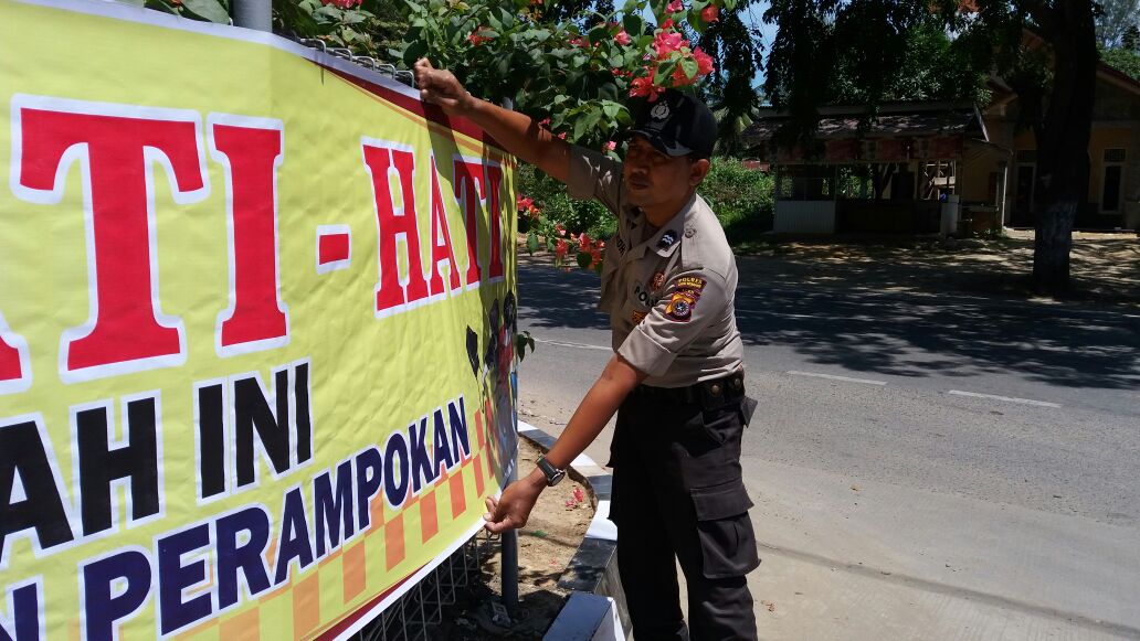 Lhokseumawe- Kepolisian Resor Lhokseumawe Sektor Muara Satu pasang spanduk himbauan kamtibmas pasang spanduk himbauan dalam rangka mengimbau masyarakat agar meningkatkan kewaspadaan terhadap lokasi-lokasi yang berpotensi terjadi perampokan, maka Polres Lhokseumawe melalui Polsek Muara Satu memasang spanduk di sejumlah lokasi, Rabu (18/10/2018).