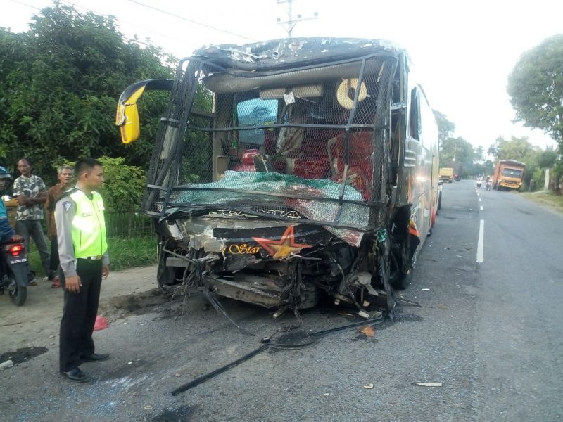 Lhokseumawe- Laka lantas dari arah berlawan terjadi antara satu unit mobil bus simpati star BL 7704 AA yang saat itu dari arah timur menuju barat (Medan menuju Banda Aceh) dengan satu unit Mobil bus simpati star BL 7751 AA dari arah barat menuju timur (Banda Aceh menuju Medan). Tabrakan terjadi dijalan Medan-Banda Aceh Desa Meunasah Drang Kecamatan Muara Batu Kabupaten Aceh Utara.” jumat (20/10/2017) sekira pukul 02.00 Wib