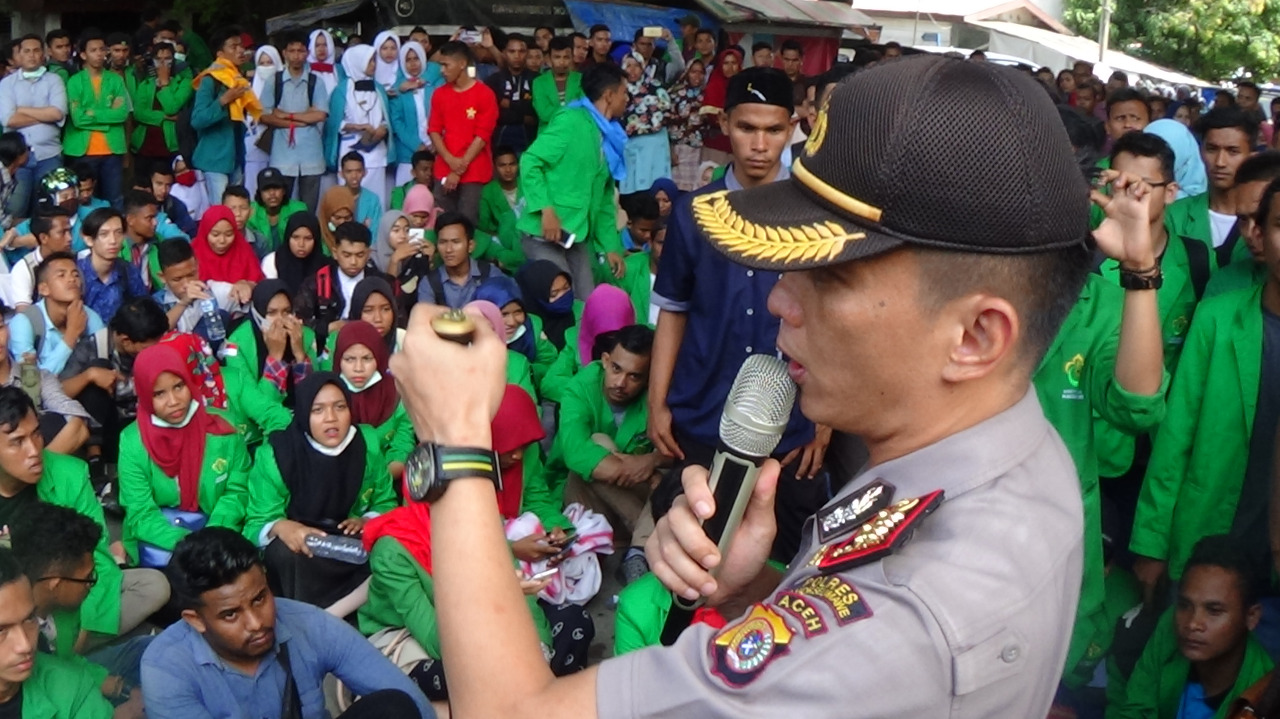 Lhokseumawe- Bubar unjuk rasa, mahasiswa teriak hidup Kapolres Lhokseumawe saat ratusan mahasiswa dihimbau bubar dengan tertib dan akan menjamin bahwa dua mahasiswa akan dikabulkan penangguhan penahanan besok hari.