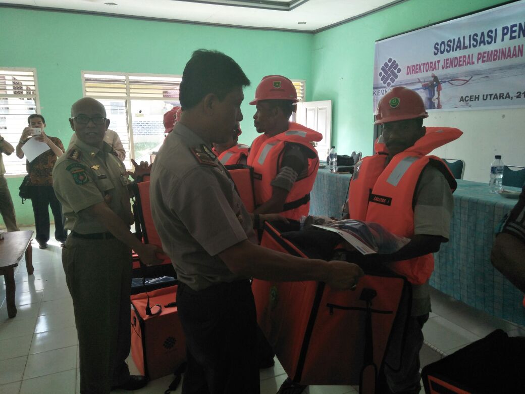 Lhokseumawe- Kapolsek Hadiri Sosialisasi dan Penyerahan alat keselamatan kerja ( K3) dari pemerintah kepada Masyarakat Nelayan Kecamatan Muara Batu Kebupaten Aceh Utara, Selasa (21/11/2017) pukul 16.00 Wib. Sebanyak 48 Kotak terdiri atas 8 macam perlengkapan diserahkan yang berlangsung di Aula Kecamatan Muara Batu Kabupaten Aceh Utara.