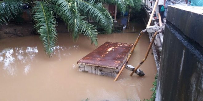 Lhokseumawe- Satu unit mobil truk Box terjun ke aliran sungai Alue Raya di Jalan Medan – Banda Aceh di bawah Jembatan Alue Raya Desa Mesjid Punteut Kecamatan Blang Mangat Kota Lhokseumawe.” Selasa pagi (5/12/2017) pukul 04.50 Wib
