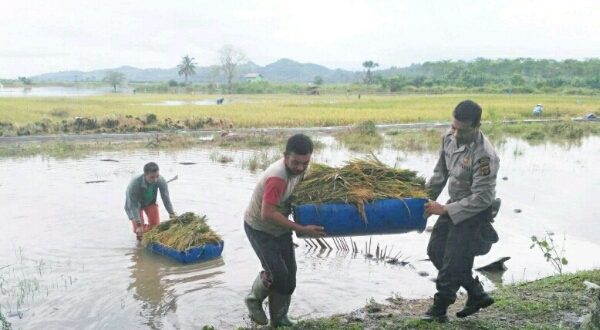 Lhokseumawe- Polisi Bhabinkamtibmas Polres Lhokseumawe Sektor Muara Satu Bripka Kharil, bantu panen dini petani padi yang gagal panen akibat sawah terendam banjir di kawasan Desa Cot Trieng Kecamatan Muara Satu Kota Lhokseumawe.” Minggu pagi (03/12/2017)