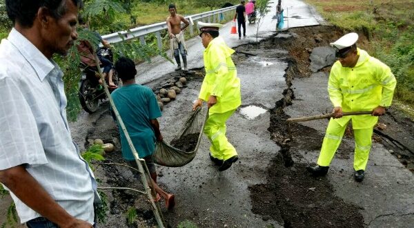 Lhokseumawe- Polantas Polres Lhokseumawe pasang Traffic Cone dan bantu masyarakat perbaiki jalan longsor akibat hujan deras di jalan KKA menuju Benar Meriah dalam kawasan Desa Jabal Antara Kecamatan Nisam Antara Kabupaten Ace Utara.” Minggu (03/12/2017)