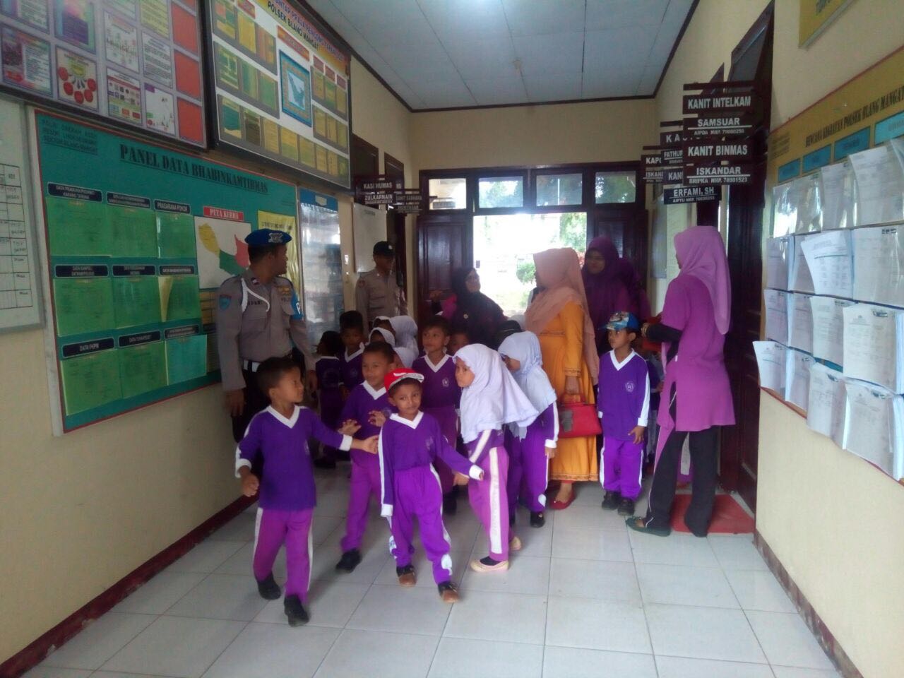 LHOKSEUMAWE- Puluhan siswa taman kanak-kanak dari TK/RA Miftahul Jannah melakukan kunjungan ke Polsek Blang Mangat resor Lhokseumawe.” Sabtu pagi (13/01/2018).