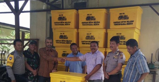 LHOKSEUMAWE – Kapolsek Muara Batu saksikan penyerahan pembagian bantuan viber untuk nelayan yang bersumer dari dana APBG 2017 di halaman kantor geucik pante gurah Kecamatan Muara Batu Kabupaten Aceh Utara.” jumat (26/01/2018)
