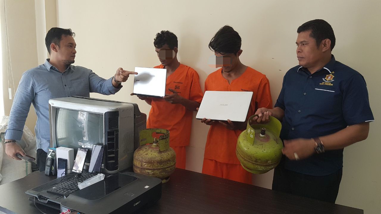 Dari para tersangka berhasil diamankan barang bukti 1 unit TV merk Ninja warna silver, 1 unit Laptop merk ASUS warna putih, 1 unit cooling pad warna hitam, 1 unit mouse bluetooth warna hitam, 1 (satu) unit modem dan 2 buah tabung gas LPG 3 kg.”imbuh Kasat Reskrim
