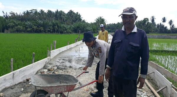 LHOKSEUMAWE- Kanit Binmas Polsek Syamtalira Bayu Respr Lhokseumawe Aiptu T.Saiful Bahri pantau dan ikut gotong royong bangun jalan rabat beton bersama masyarakat di Desa Dayah Baro Kecamatan Syamtalira Bayu Kabupaten Aceh Utara.”Jum’at (19/01/2018) sekira pukul 10.00 WIB