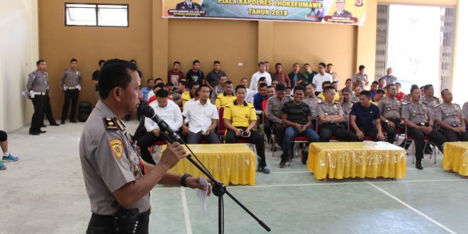 Kapolres Lhokseumawe AKBP Hendri Budiman, SH, S.Ik, MH dalam sambutannya mengucapkan terima kasih kepada panitia atas pelaksanaan turnamen piala Kapolres 2018 dan atas dukungan semua pihak turnamen ini dapat terlaksana. mudah-mudahan kedepan ada turnamen olahraga yang memang bisa dikembang terhadap fasilitas dan prasarana yang ada baik milik Polres Lokseumawe ataupun pemerintah Kota Lhokseumawe.”imbuh Kapolres
