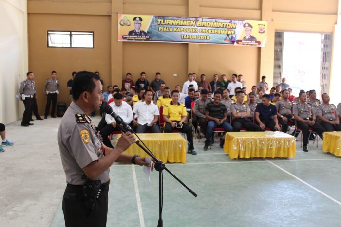 LHOKSEUMAWE- Kapolres Lhokseumawe AKBP Hendri Budiman, SH, S.Ik, MH gelar turnamen Badminton Piala Kapolres yang berlangsung di gedung serba guna Polres Lhokseumawe. Turnamen tersebut diikuti 38 peserta dari mulai unsur pejabat utama, personil Polres dan Polsek jajaran Polres Lhokseumawe.