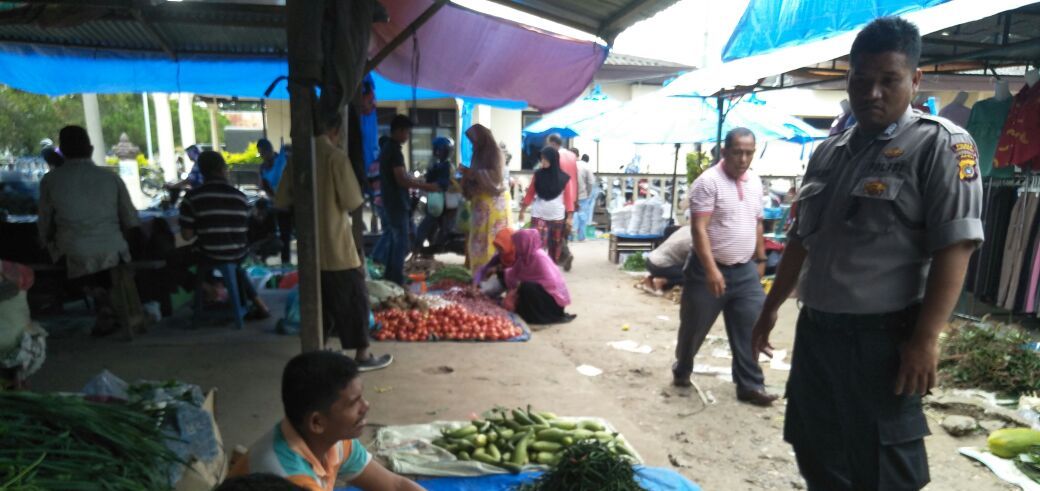 LHOKSEUMAWE- Antispasi Guantibmas, Polisi Bhabikatibmas Polsek Muara Satu Brigdir Iqbal Palindunan melakukan Patroli dialogis di Pasar Batu Phat Kecamatan Muara Satu Kota Lhokseumawe.” Sabtu pagi (15/01/2018)