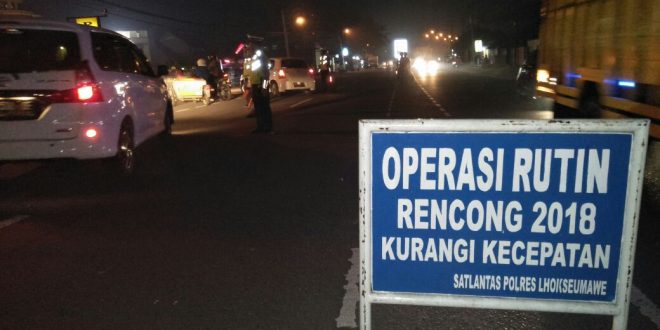 LHOKSEUMAWE– Personil Satuan Lantas Polres Lhokseumawe gelar razia rutin didepan Mapolres Lhokseumawe, sabtu malam (20/01) sekitar pukul 21.00 WIB. razia tersebut untuk menekan angka kriminalitas dan pelanggaran lalu lintas di Kota Lhokseumawe.
