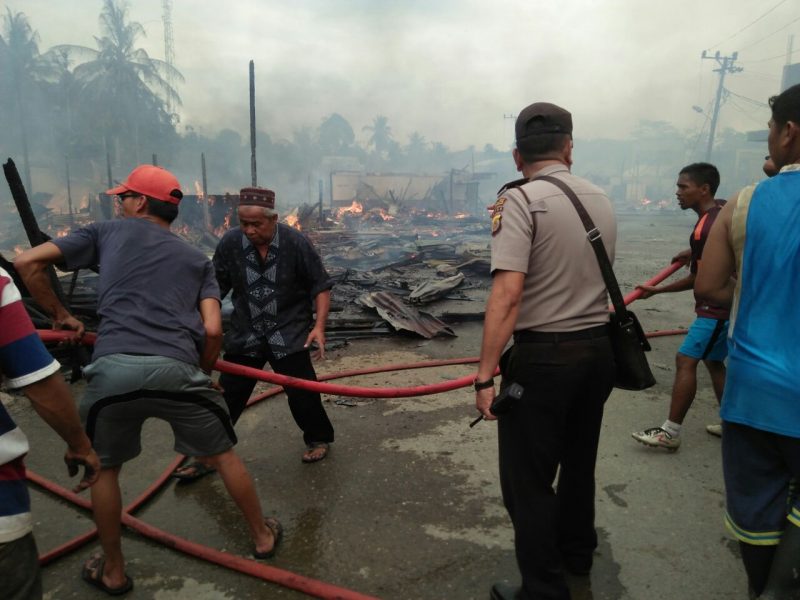 LHOKSEUMAWE- Puluhan toko berkontruksi kayu atau semi permanen ludes terbakar di Keude Simpang Kramat Kabupaten Aceh Utara,” sabtu (27/01/2018) sekitar pukul 15.00 WIB. Tidak ada korban jiwa dalam peristiwa kebakaran tersebut.