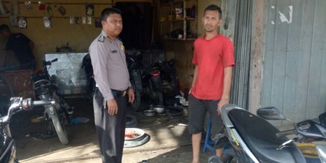 LHOKSEUMAWE- Kanit Binmas Polsek Samudera Bripka Yunizar Tambunan sambangi bengkel sepeda motor Desa Kuta Glumpang Kecamtan Samudera Kabupaten Aceh utara.”kamis pagi (25/01/2018)