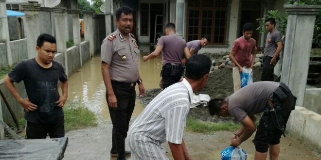 LHOKSEUMAWE- Polisi bantu warga membuat karung pasir penahan air di lokasi jebolnya tanggul yang membuat rumah sejumlah warga terdampak banjir di tiga Desa Kecamatan Samudera Kabupaten Aceh Utara.”kamis pagi (04/01/2018) sekitar pukul 06.00 Wib.