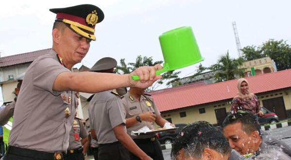 LHOKSEUMAWE – Tradisi mandi air kembang warnai acara kenaikan pangkat 7 personil Polres Lhokseumawe di Mapolres Lhokseumaw yang dipimpin langsung oleh Kapolres Lhokseumawe AKBP Hendri Budiman, SH, S.Ik, MH.” Rabu pagi (03/01/2018)