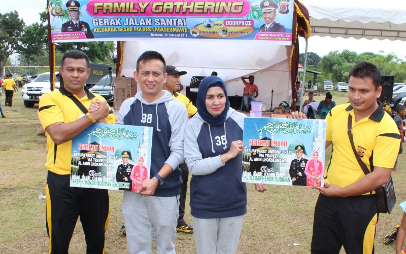 LHOKSEUMAWE- Kapolres Lhokseumawe AKBP Hendri Budiman, SH, S.Ik, MH bersama istri NY. Gamar Hendri Budiman berangkatkan dua anggotanya umrah gratis, dua personil tersebut terpilih saat dilakukan seleksi dan undian pada acara family gathering di pantai Rancung Desa Batphat Timur Kecamatan Muara Satu, Kota Lhokseumawe,”Minggu pagi (25/02/2018)