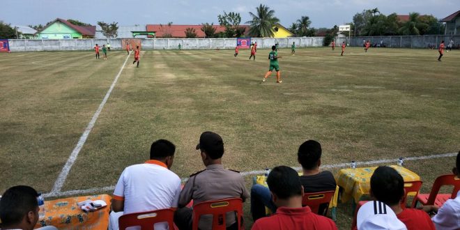 LHOKSEUMAWE- Personil Kepolsian Sektor Muara Batu, melakukan pengamanan pertandingan uji coba bola kaki Liga 2 Indonesia di Stadion Muara Batu, Rabu (7/2/2018), sekira pukul 16.00 Wib. Perdingan uji coba tersebut mempertandingkan antara Aceh United VS Tim Remaja Muara Batu Krueng Mane.