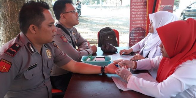 LHOKSEUMAWE- Personil Polsek Sawang donor darah untuk berpartisipasi dalam kegiatan sosial donor darah massal dalam rangka Bakti Amal KNPI PK Sawang di halaman Kantor Camat Kecamatan Sawang Kabupaten Aceh Utara .” Senin pagi (12/02/2018)