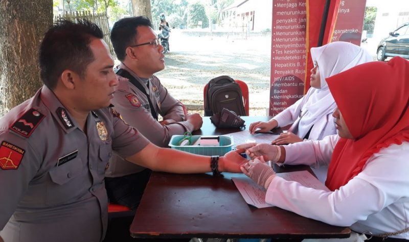LHOKSEUMAWE- Personil Polsek Sawang donor darah untuk berpartisipasi dalam kegiatan sosial donor darah massal dalam rangka Bakti Amal KNPI PK Sawang di halaman Kantor Camat Kecamatan Sawang Kabupaten Aceh Utara .” Senin pagi (12/02/2018)